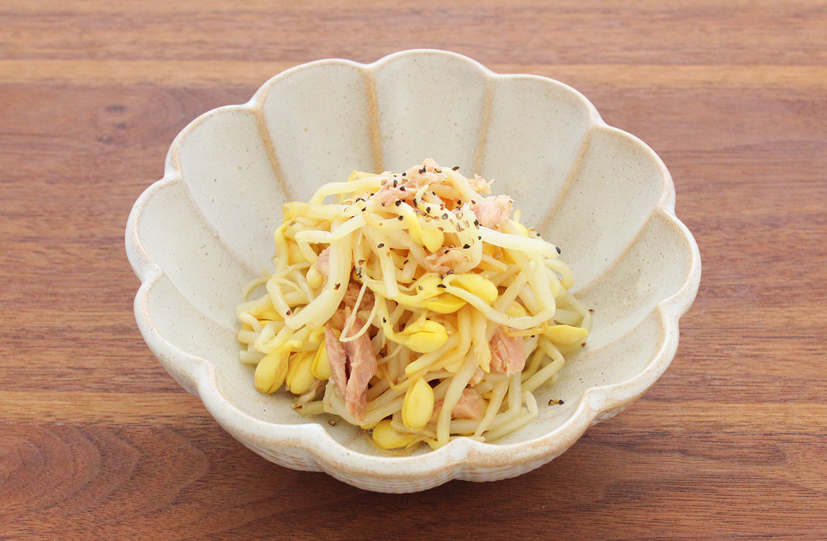 ボウルに大豆もやし塩レモン仕立てを調味液ごと入れ、油を切ったツナ缶を混ぜ合わせる。(液の量はお好みで調整してください。)