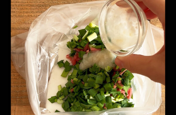ポリ袋にはんぺん、(1)、塩糀、片栗粉を入れて、はんぺんを潰しながらもむ。