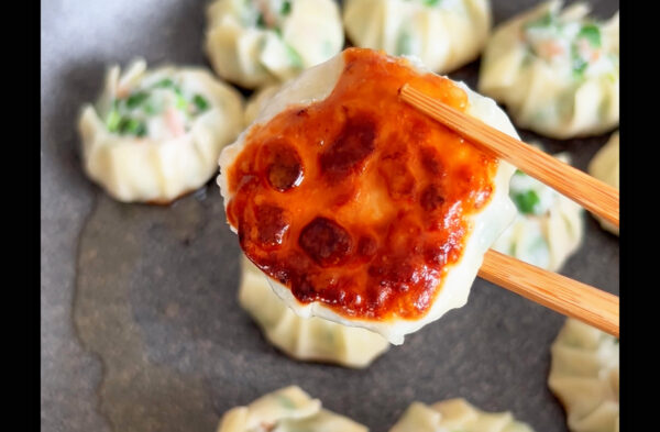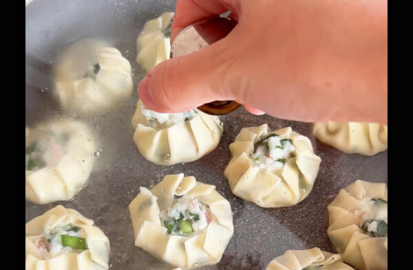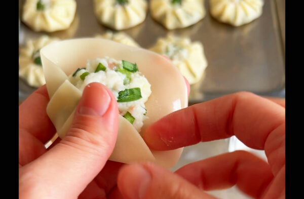 餃子の皮のフチを水(分量外)で濡らして、(2)を包む。