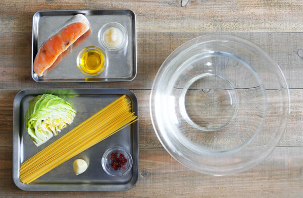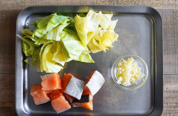 鮭は食べやすい大きさに切り、骨があれば取り除く。キャベツはざく切り、にんにくはみじん切りにする。