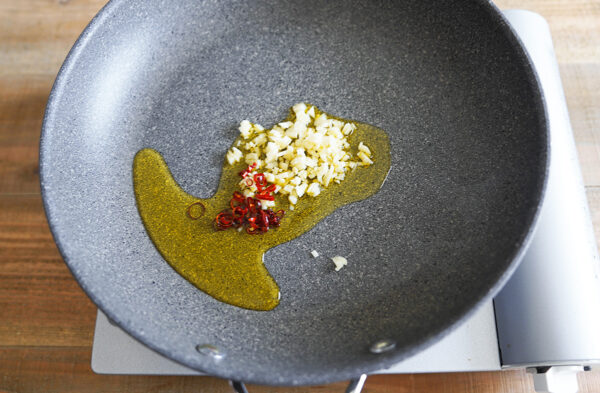 フライパンにオリーブオイル、にんにく、輪切り唐辛子を入れてから、弱火にかけてじっくりと加熱する。