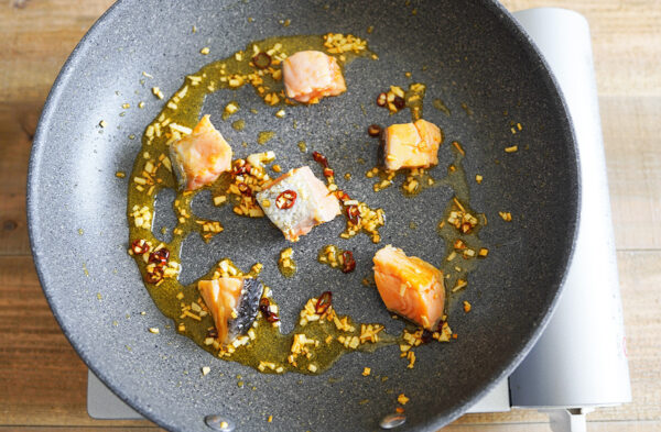 にんにくの香りが立ってきたら、鮭の表面をサッと焼いて一旦取り出す。