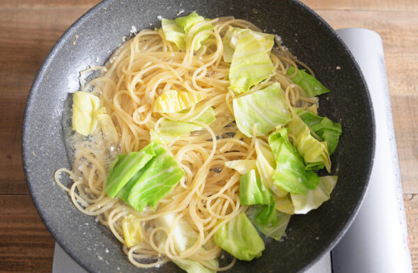 同じフライパンに水、塩糀を入れて沸騰させる。スパゲッティを入れて、ときどき混ぜながら中火でゆでる。袋の表示より2分短いタイミングで、キャベツを加える。
