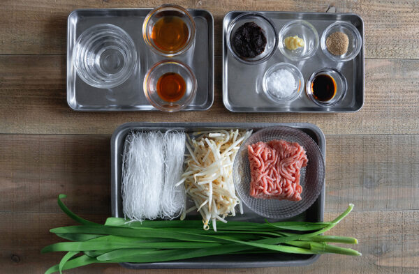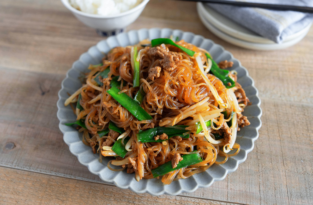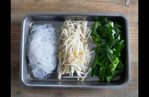 ニラはざく切りにする。もやしは水にさらして水気を切る。春雨は袋の表示時間通りゆでる。