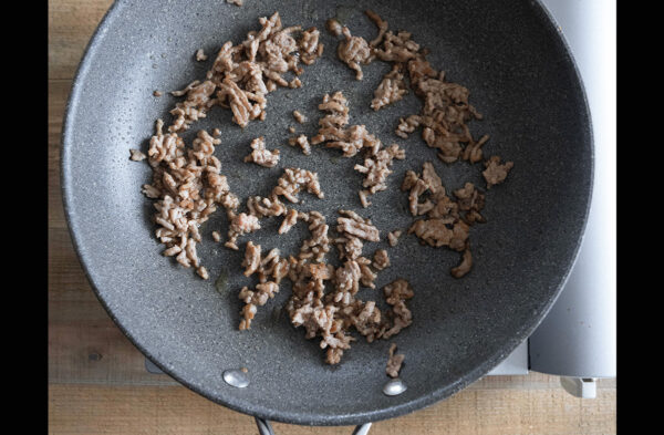 フライパンに油を熱し、豚挽き肉を入れて色が変わるまで中火で炒める。