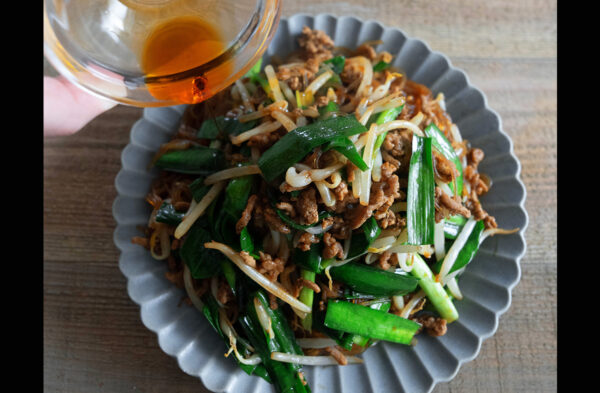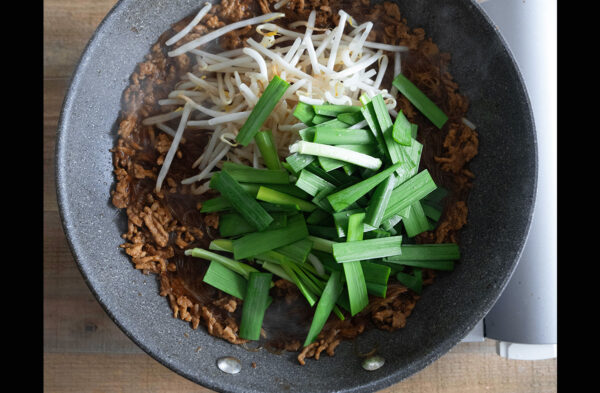 もやし、ニラを加えて中火でサッと炒める。