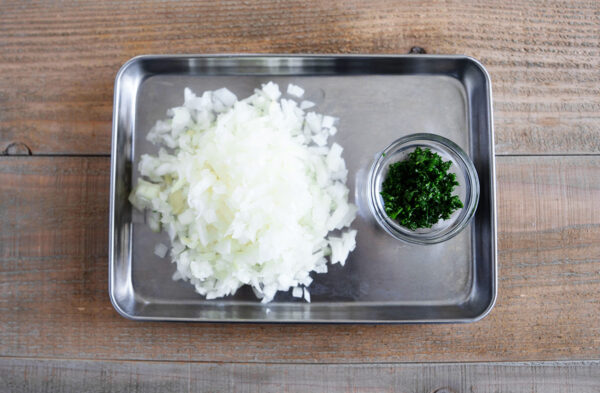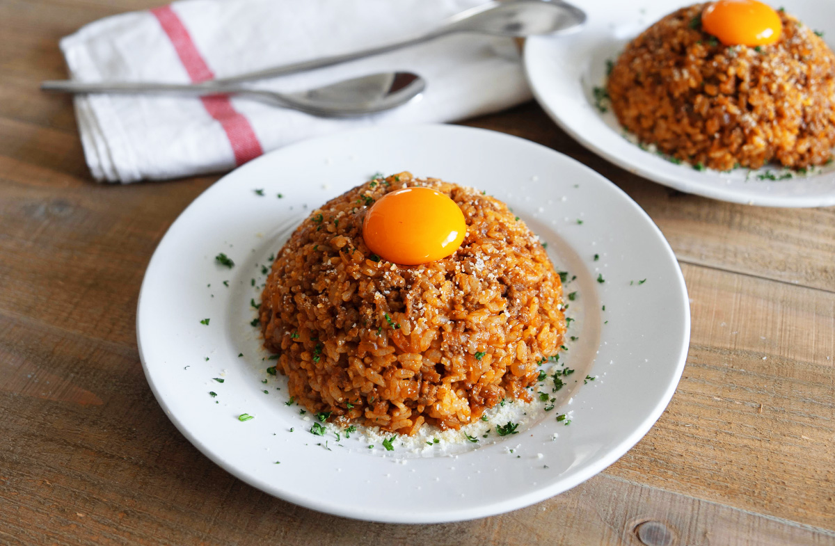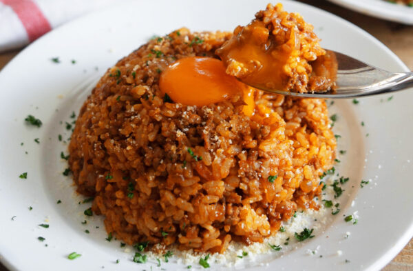 (4)を器に盛りつけ、卵黄をのせる。お好みでパセリと粉チーズを振る。