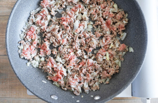フライパンに油を熱し、(1)、合い挽き肉を色が変わるまで中火で炒める。