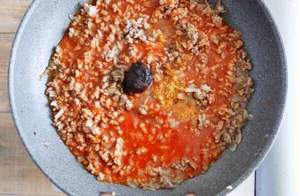 (2)に厳選国産赤だし、トマトジュース、コンソメ、ウスターソースを加えて弱火で3分煮る。
