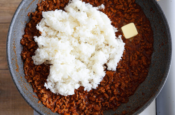 (3)にご飯、バターを加え、弱火で混ぜ合わせる。