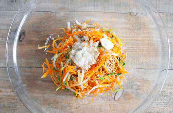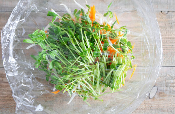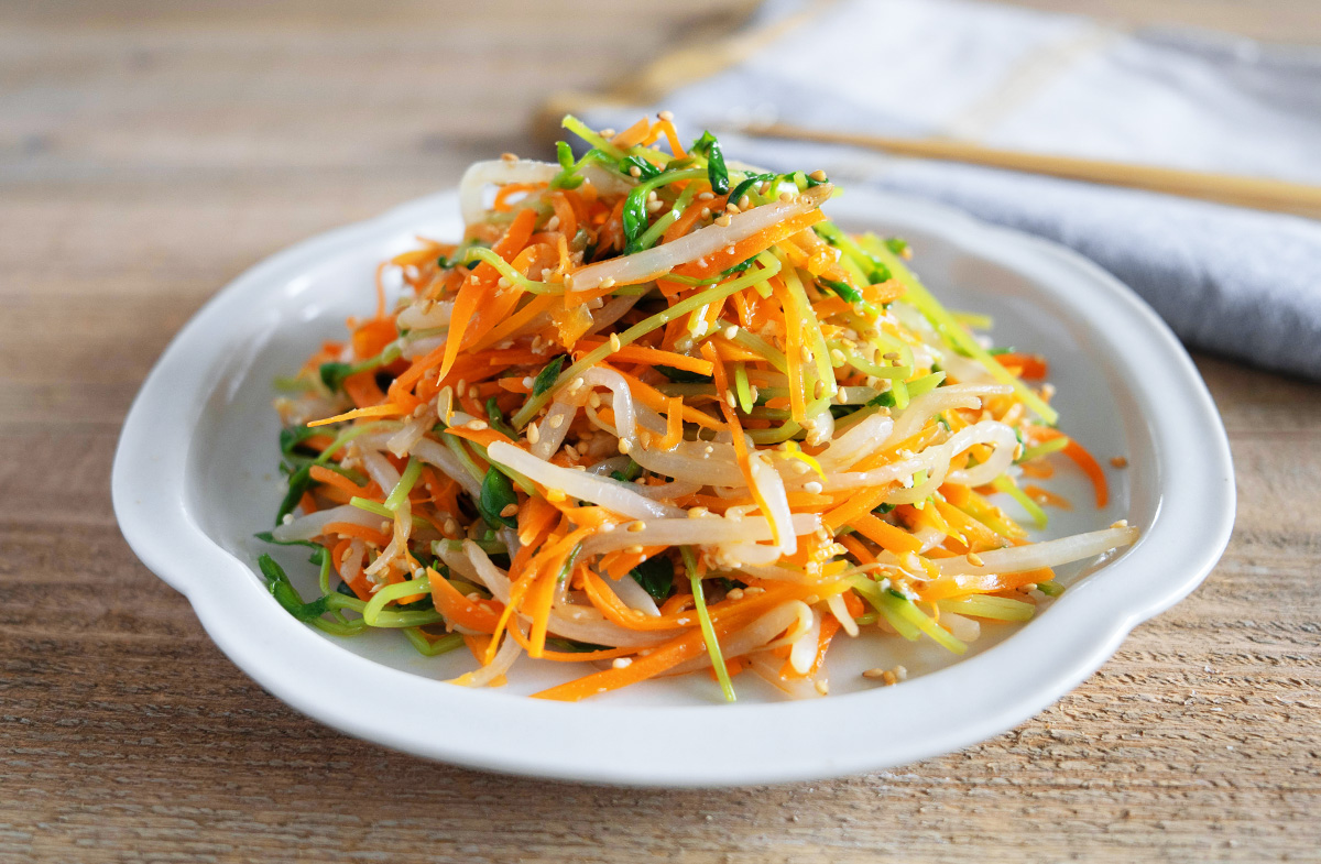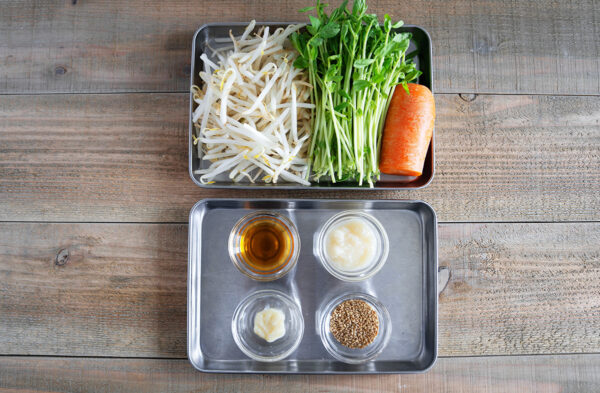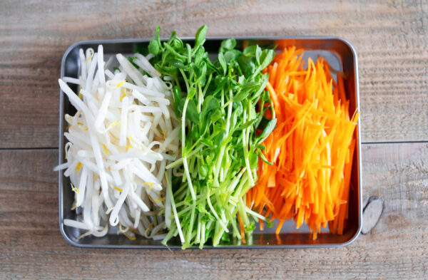 にんじんは千切り、豆苗は根元を切って半分に切る。もやしは水にさらして洗う。
