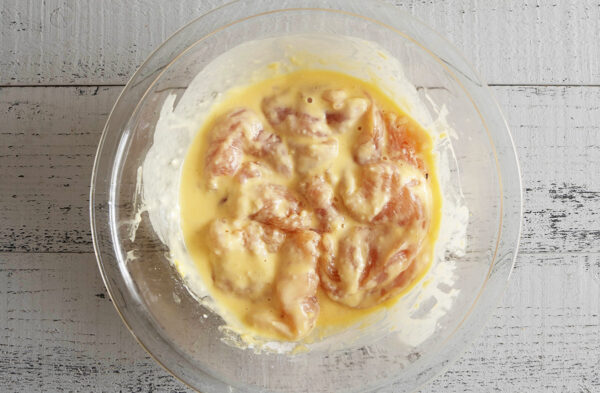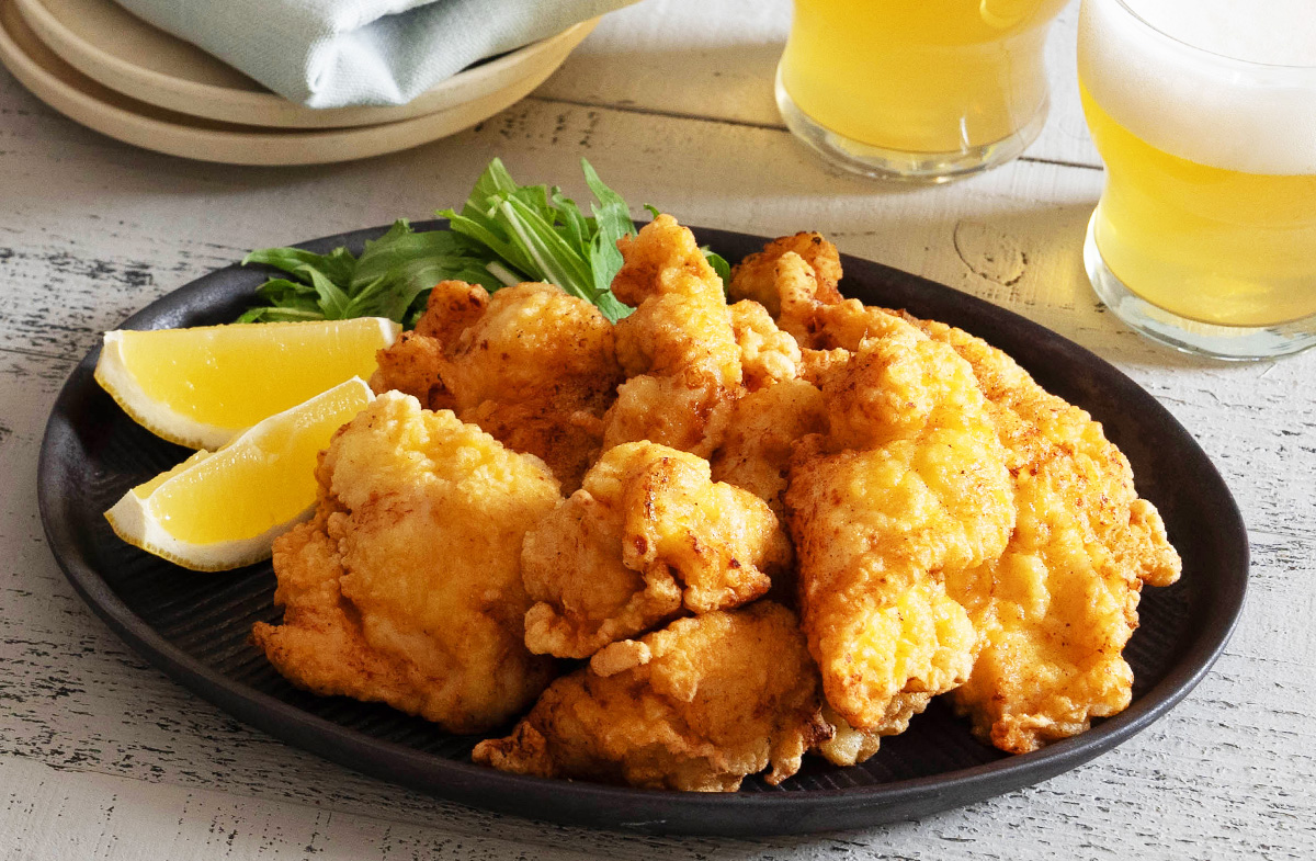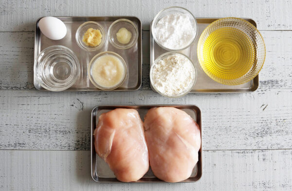 鶏肉は薄めのそぎ切りにすることで、火が通りやすくなり、少量の油で揚げ焼きにしても衣が水っぽくなりません。衣は薄力粉と片栗粉を使い、冷水で手早く混ぜることでサクッと揚がります。