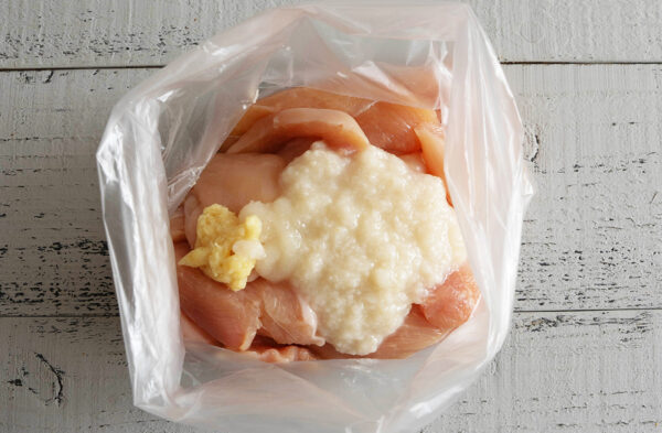 ポリ袋に(1)を入れ、塩糀、おろししょうが、おろしにんにくをもみ込み、15分置く。