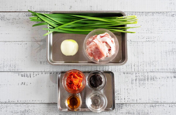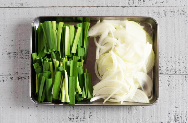 玉ねぎは薄切りにする。ニラは4cm幅に切る。