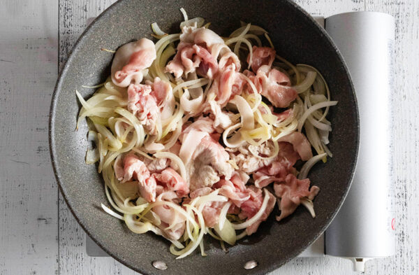 フライパンにごま油を熱し、豚肉、玉ねぎを加えて玉ねぎがしんなりするまで炒める。