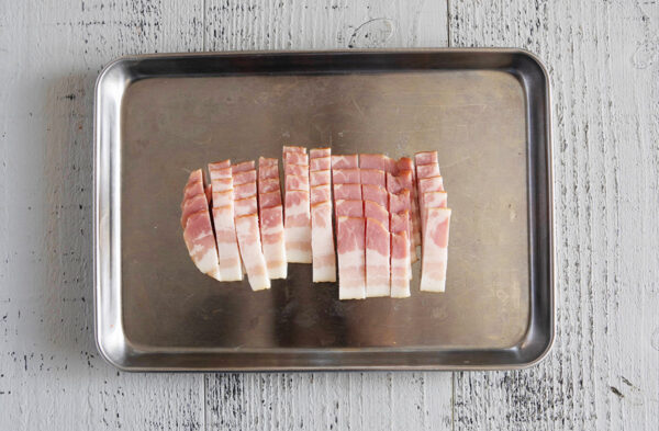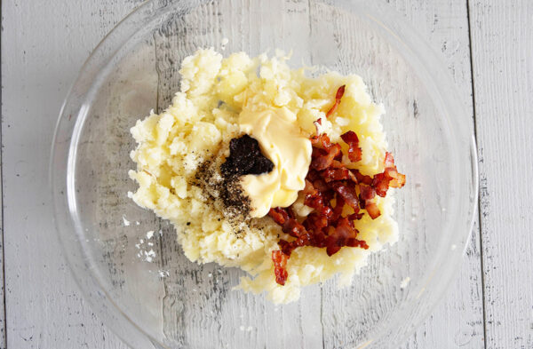 冷める前にじゃがいもの皮をむいて潰し、ベーコン、厳選国産生赤だし、マヨネーズ、黒こしょうを混ぜる。