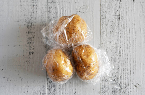 じゃがいもはラップで包み、電子レンジ(600W)で4分30秒加熱する。
