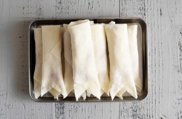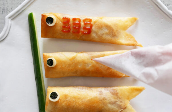 (4)を春巻きの皮で包み、こいのぼりの形に整える。