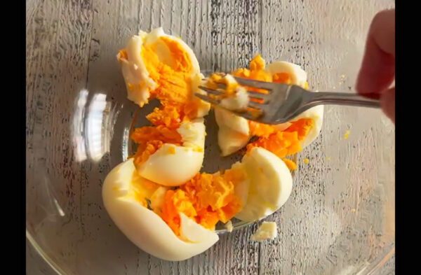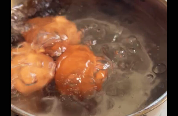 鍋に水を沸騰させ、冷蔵庫から取り出した卵を入れ、10分ゆでて冷水につける。