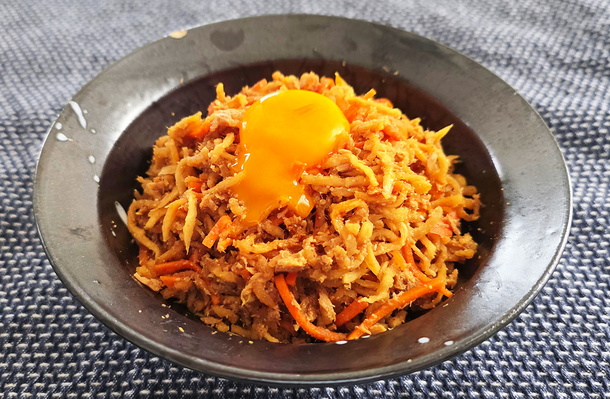 ボウルににんじん、ツナ、切干大根を入れて混ぜ、(3)を加えて混ぜ合わせ、すりごまを加えてさらによく混ぜて卵黄をのせる。