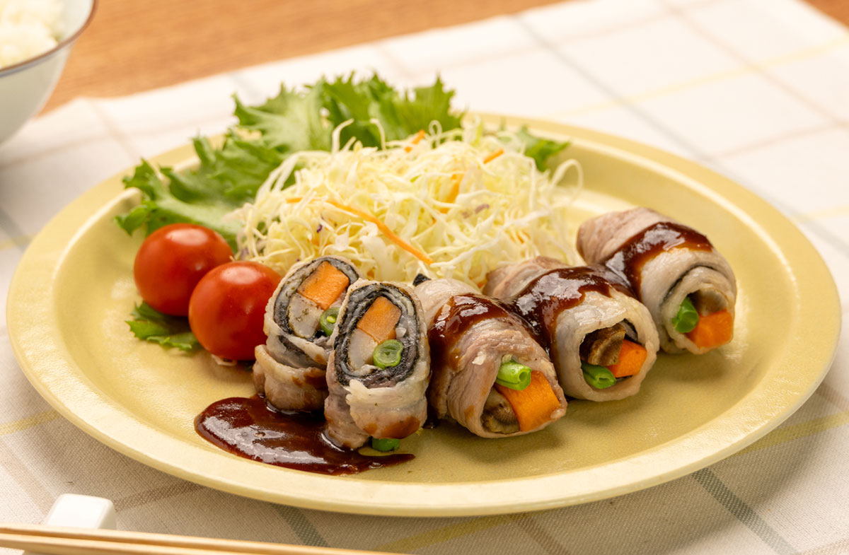 豚肉を広げ、片栗粉をふる。味のりてりやき2枚を重ならないようにのせ、(1)をのせて巻く。同様に8個作る。※巻きはじめは強めに巻く。