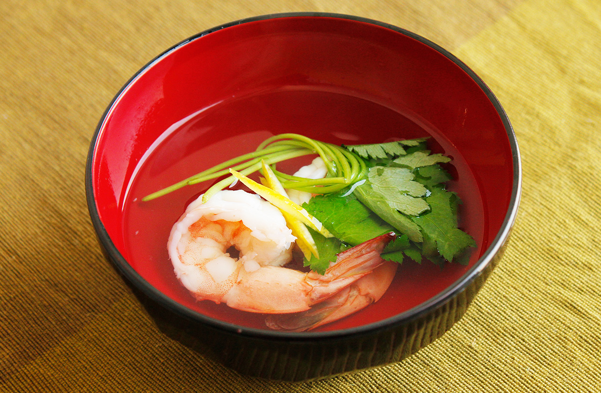 京料亭白だしで!エビと三つ葉のお吸い物(すまし汁)