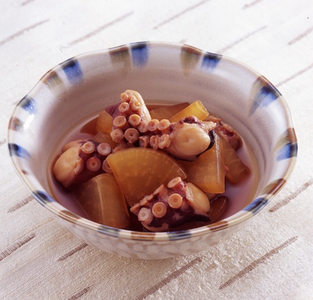 大根は皮をむき、2cmの厚さに切り面取りをして、下ゆでする。