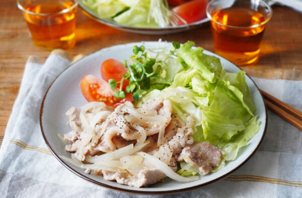 フライパンに油を熱して豚肉を焼き、玉ねぎを加えて炒める。