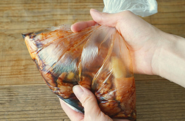 鶏モモ肉は皮目にフォークで穴をあけ、ポリ袋に入れてAをもみ込み、冷蔵庫で30分漬け込む。
