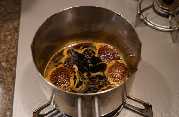 鍋にBを入れ、軽く沸騰させながらとろみが出るまで煮詰めて「たれ」を作る。