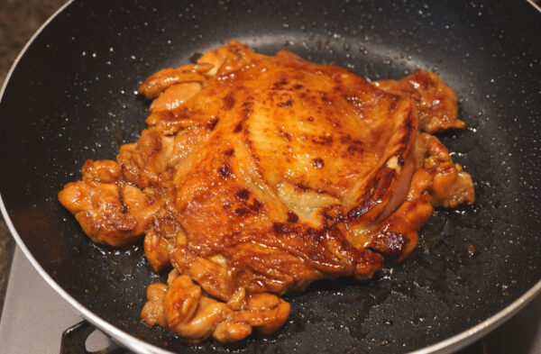 フライパンに油を熱し、(1)を皮目から焼く。皮がパリパリになったら裏返し、フタをして弱火で全体に火を通す。