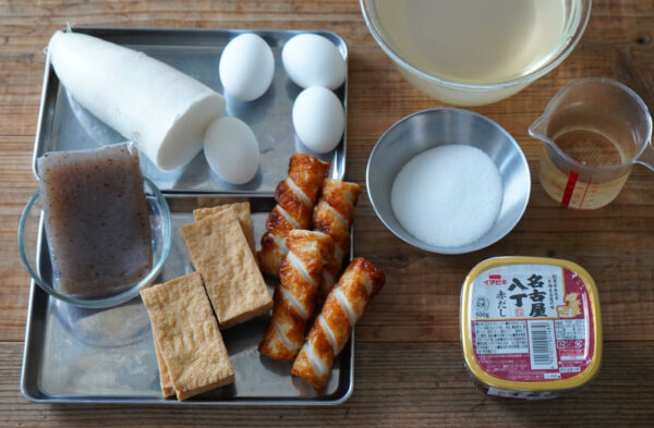 卵はゆでて殻をむき、こんにゃく、焼ちくわ、厚揚げは食べやすい大きさに切る。