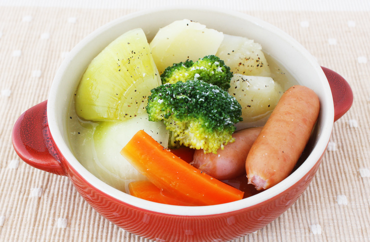 鍋に水と塩糀、具材を入れ、やわらかくなるまで煮込む。