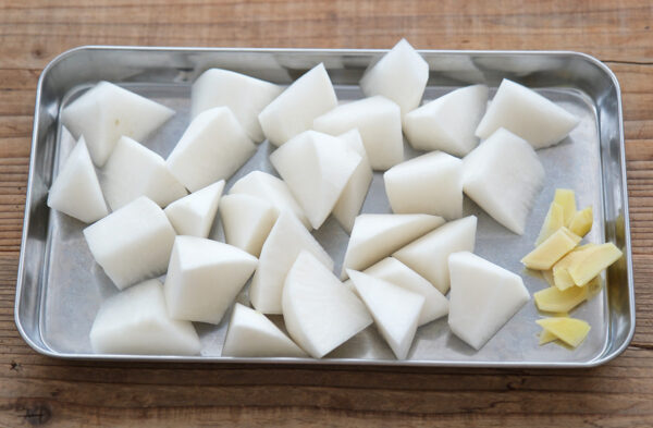 大根は食べやすい大きさに切る。しょうがは薄切りにしてから半分に切る。