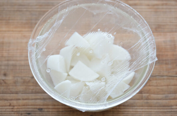 大根をボウルに入れ、ふんわりとラップをかけ、電子レンジ(500W)で5分加熱する。