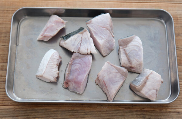 ブリを食べやすい大きさに切って、表面が白くなるまで熱湯をかける。