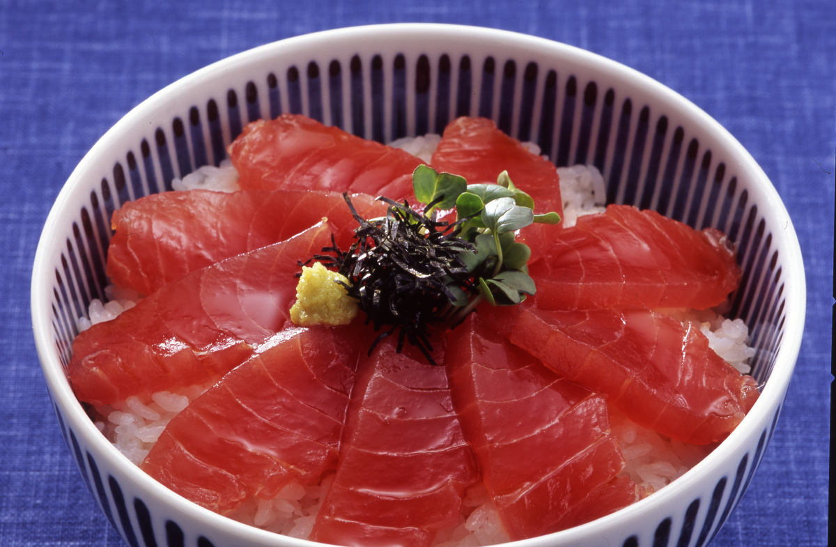 丼にご飯を盛り、マグロを盛り付け、漬け汁をかけ、刻みのりとわさびを添える。