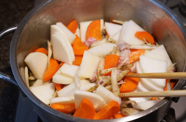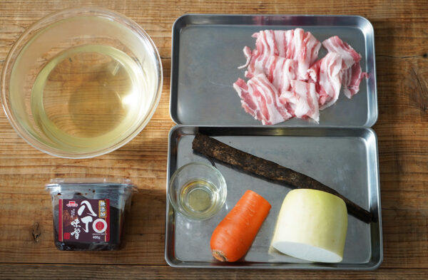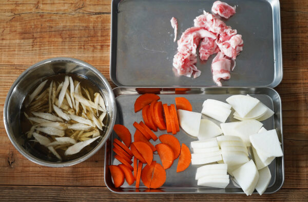豚肉、野菜は食べやすい大きさに切る。(ごぼうはささがきにし、5分程水にさらす。)