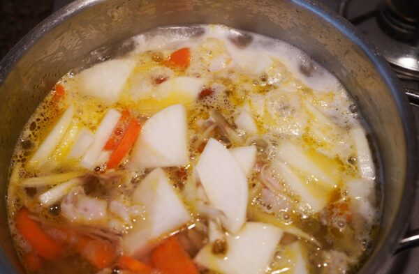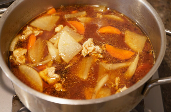 全体に油が回ったらだし汁を加え、煮立ったらアクを取り、フタをして10分程煮る。