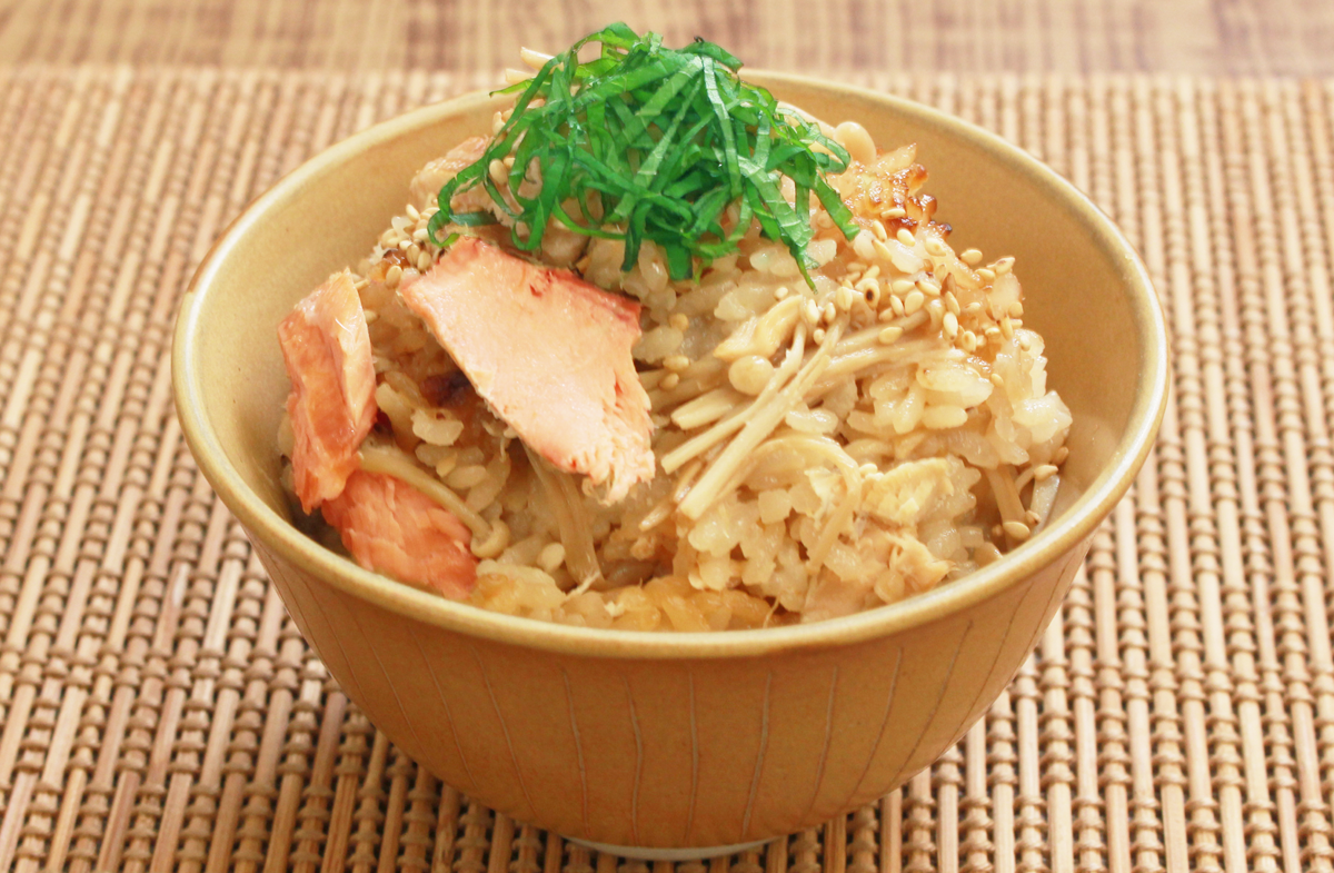 献立いろいろつゆで味付け完了!鮭とえのきの炊き込みご飯