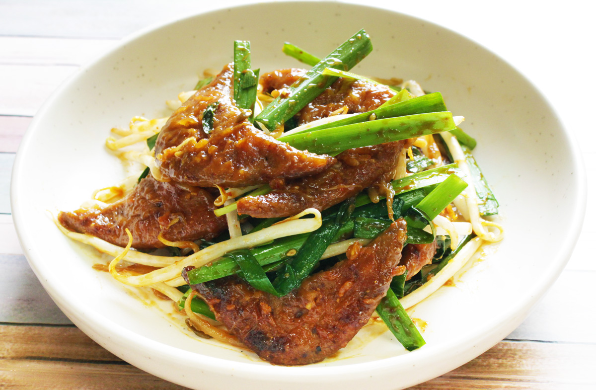 フライパンの油を軽く拭き、にらともやしを炒める。