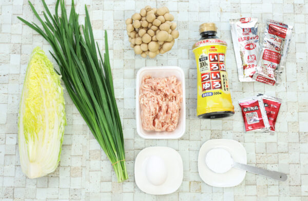 白菜は5cm角、ニラは5cmの長さ、しめじは小房にほぐす。