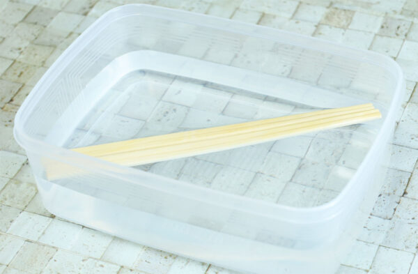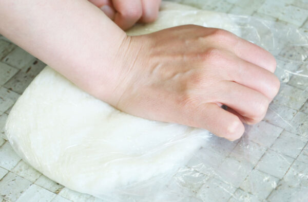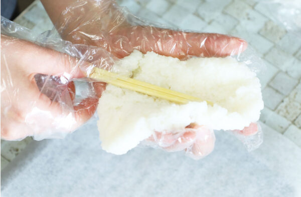 (3)を2つに分けて平たく伸ばし、割りばしを包みこむようにして、わらじ型に整える。