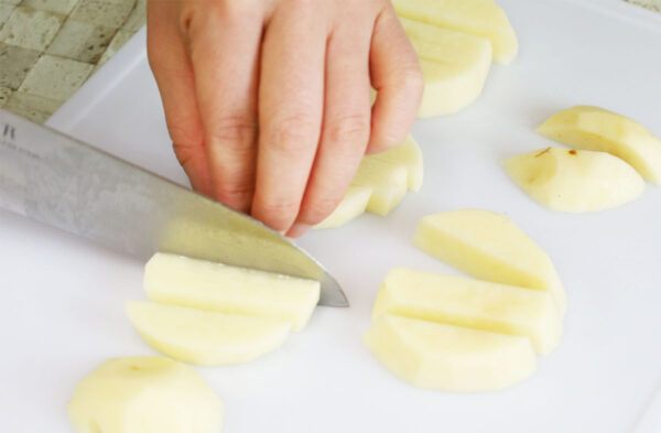 じゃがいもを棒状に切り、耐熱皿に入れて、ふんわりとラップをかけ、電子レンジ(600W)で4分加熱する。