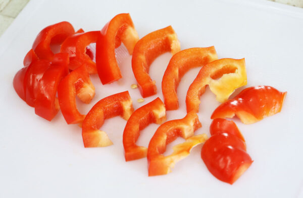 【下味冷凍】鶏肉の繊維を断つように、そぎ切りにする。