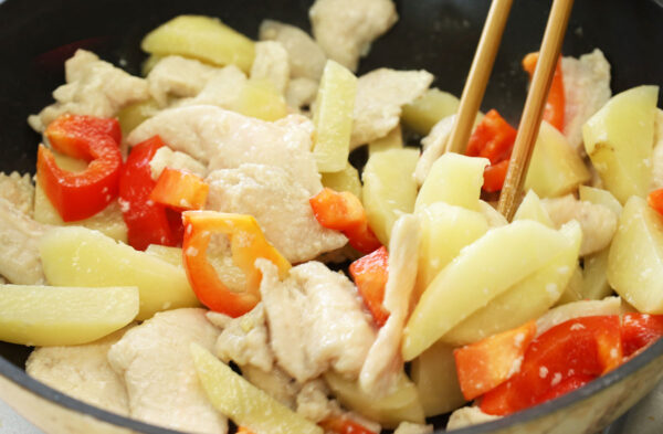 フライパンに油を弱火で熱し、(4)を漬けだれごと加えて炒め、焼き色がついたら、じゃがいもとパプリカを加えて炒め合わせる。