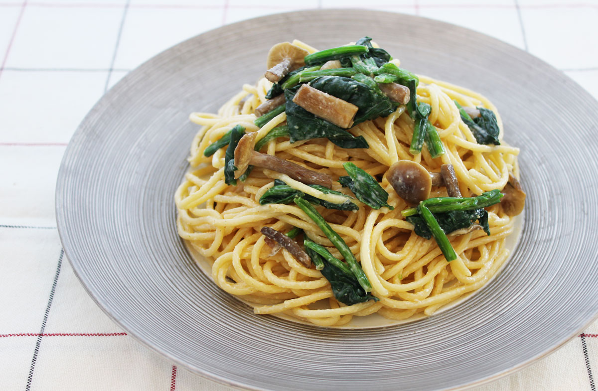 キノコとほうれん草のみそクリームパスタ(スパゲッティ)