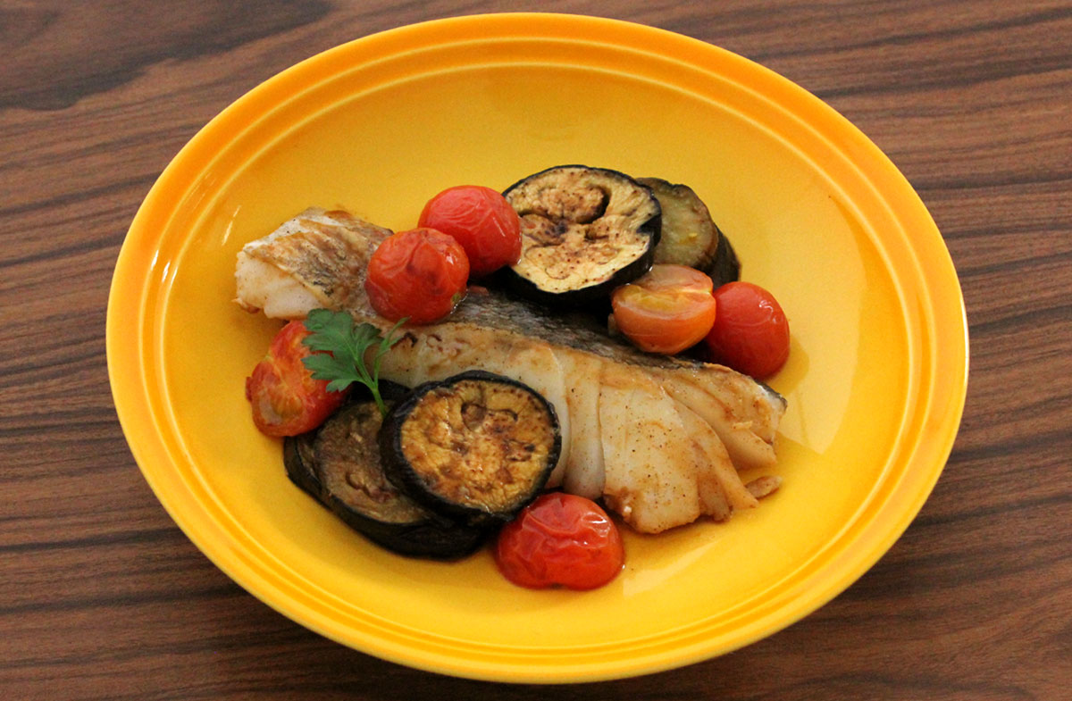 フライパンにオリーブオイルを熱し、タラとなすに焼き目をつける。