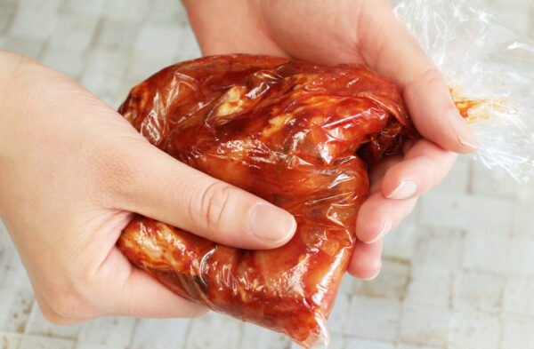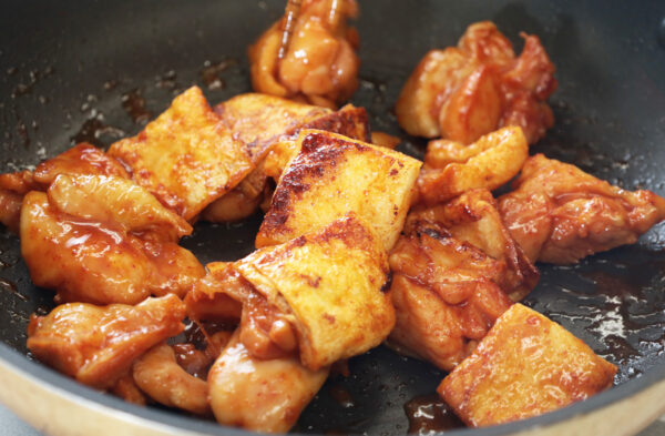 鶏肉を一口大に切り、赤から鍋スティックをもみ込む。