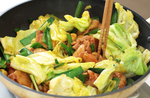フライパンに油を熱し、鶏肉と油揚げに軽く焼き色をつける。